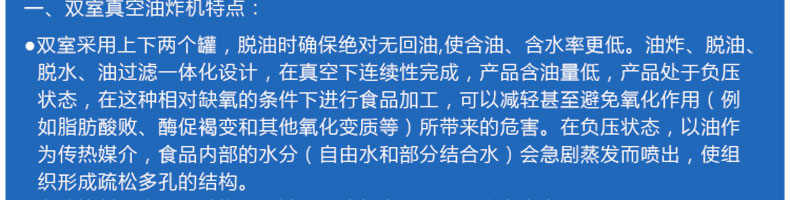 zk-700双室低温真空油炸机,适用于水果类、蔬菜类、干果类、水产品机畜禽肉类等。自动控制温度,无过热、无过压,确保产品质量和安全生产。
